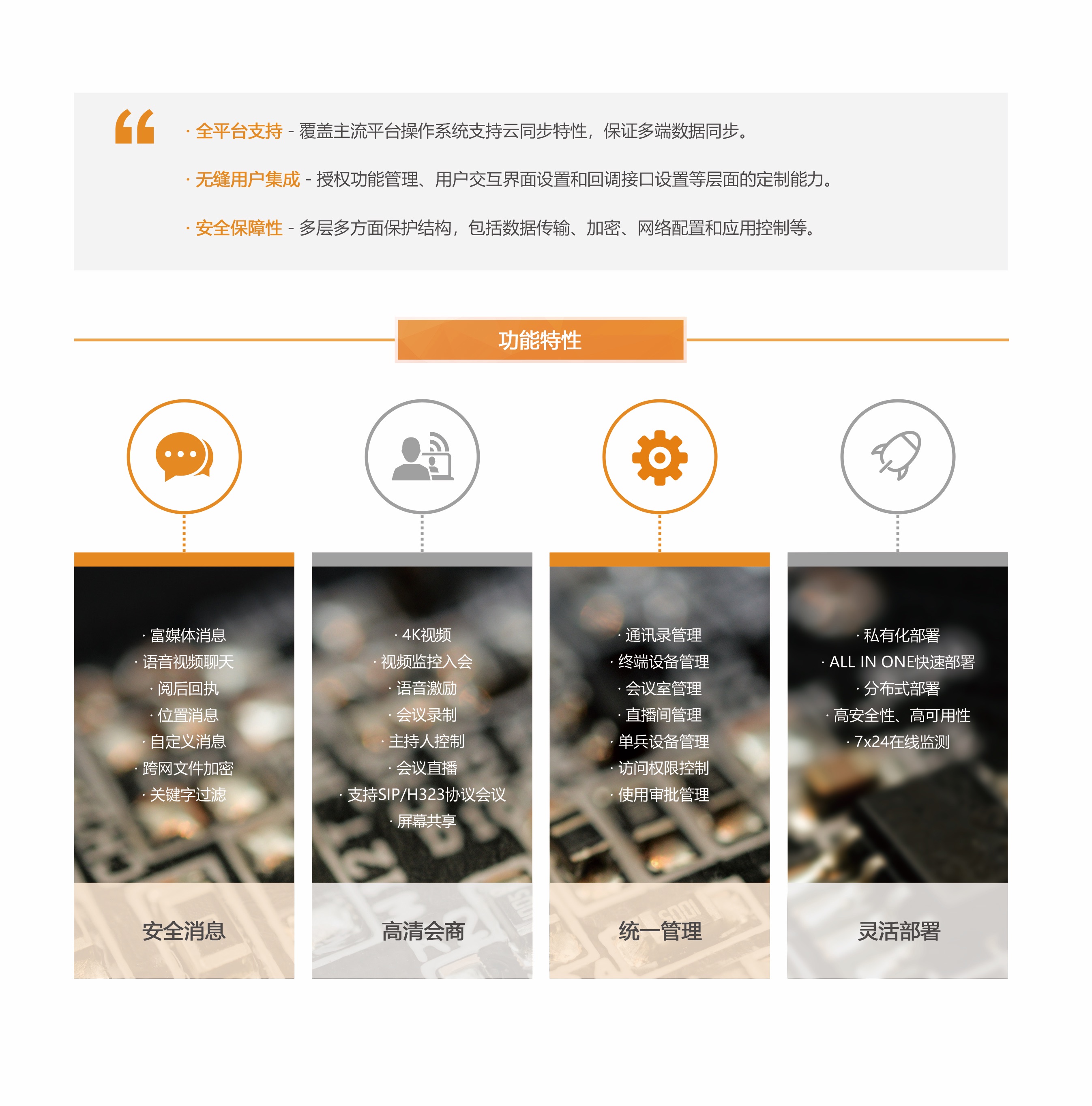 視訊融合平臺采用云架構設計理念,使用多種核心技術優化移動網絡下音視頻傳輸,保障用戶在波動的網絡環境下也能達到最佳的音視頻交互體驗。平臺支持視頻會議、即時消息、監控調度、視頻圖傳、可視化地圖等多種功能,提升了用戶協作;支持桌面終端、移動終端、智能視訊終端等多種類型終端接入,保障用戶任意時間、任意地點、任意方式,都可以享受到高品質的通信服務。 平臺具備超大容量、多形態部署、多種通信模式、靈活權限控制、統一通訊錄集成等特性,同時還通過開放式接口,提供強大的用戶定制功能,滿足多種行業使用場景。